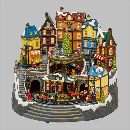 Villaggio di Natale innevato con luci e treno in movimento 21x21x38 cm