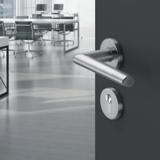 Maniglia Hoppe Stockholm rosetta e bocchetta tonde d. 52 mm foro cilindro acciaio satinato Secusan