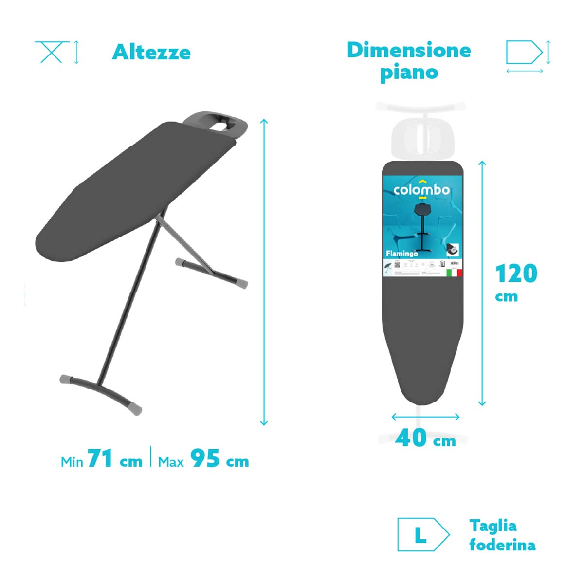 - Dimensione piano da stiro: 120 x 40 cm