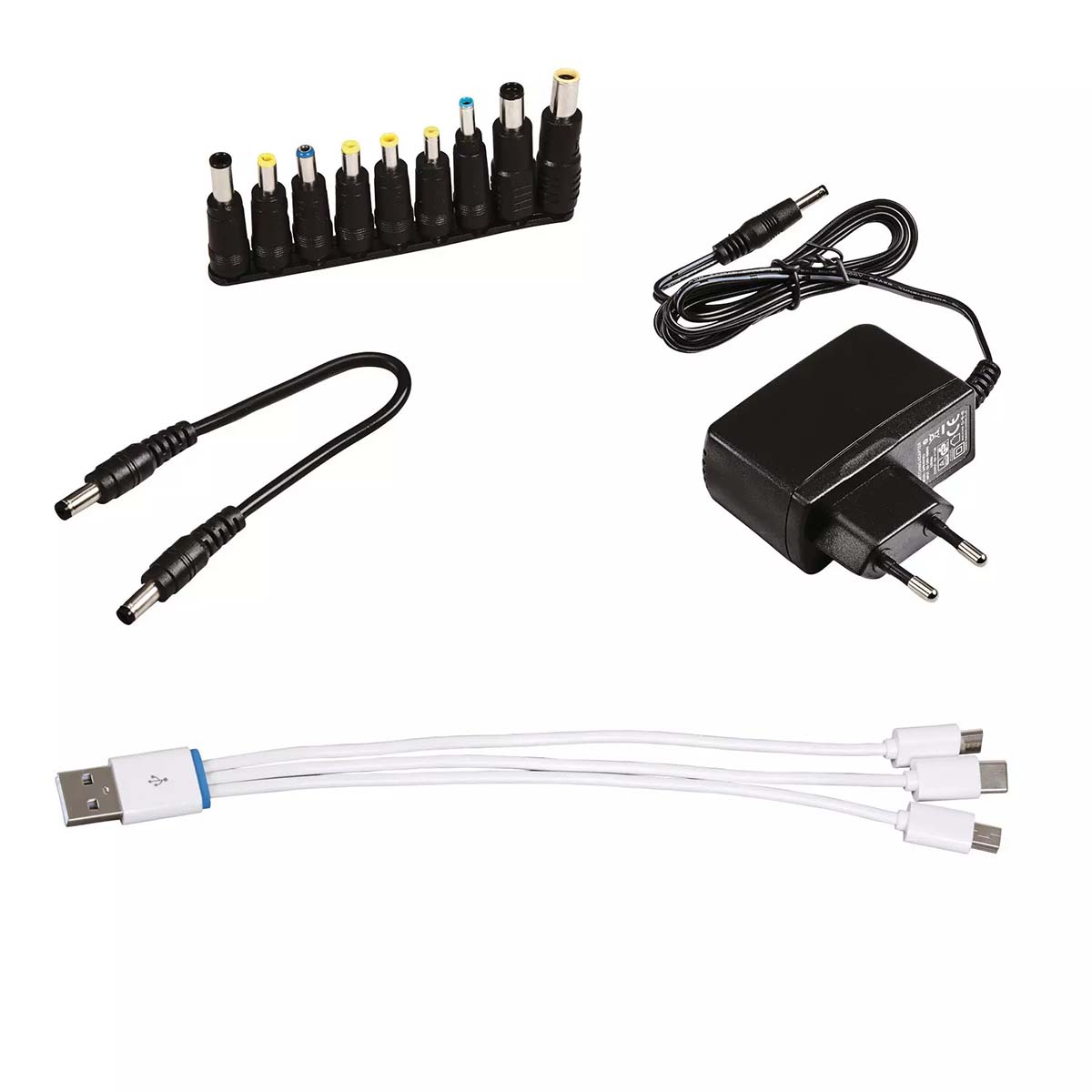Il set include tutto il necessario: cavi di avviamento con morsetti isolati, protezione da sovraccarico, cavo adattatore USB con 9 connettori per notebook, alimentatore 230 V e una custodia protettiva per trasporto e riparazione sicura.