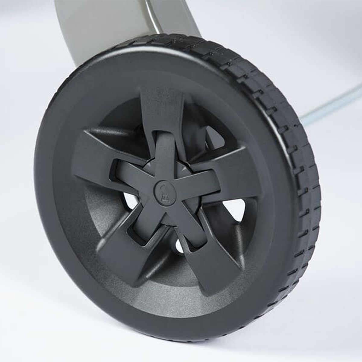 I ripiani laterali, di cui uno ripiegabile, offrono spazio extra per utensili e condimenti, mentre i 6 ganci portautensili mantengono tutto in ordine e a portata di mano. Il design del carrello aperto facilita l’accesso alla bombola del gas e offre una pratica area di stoccaggio. Le ruote robuste rendono semplice lo spostamento del barbecue anche su superfici irregolari.