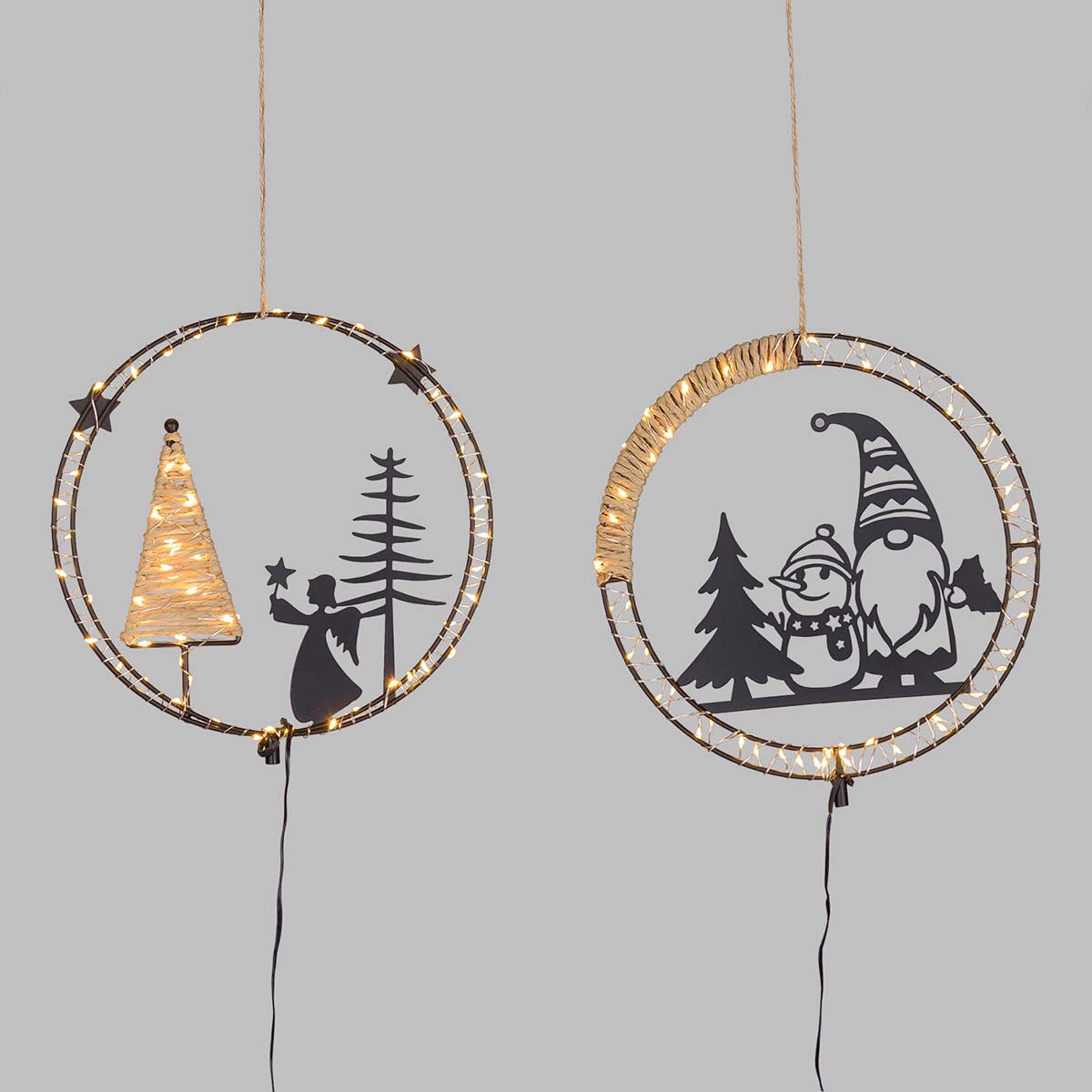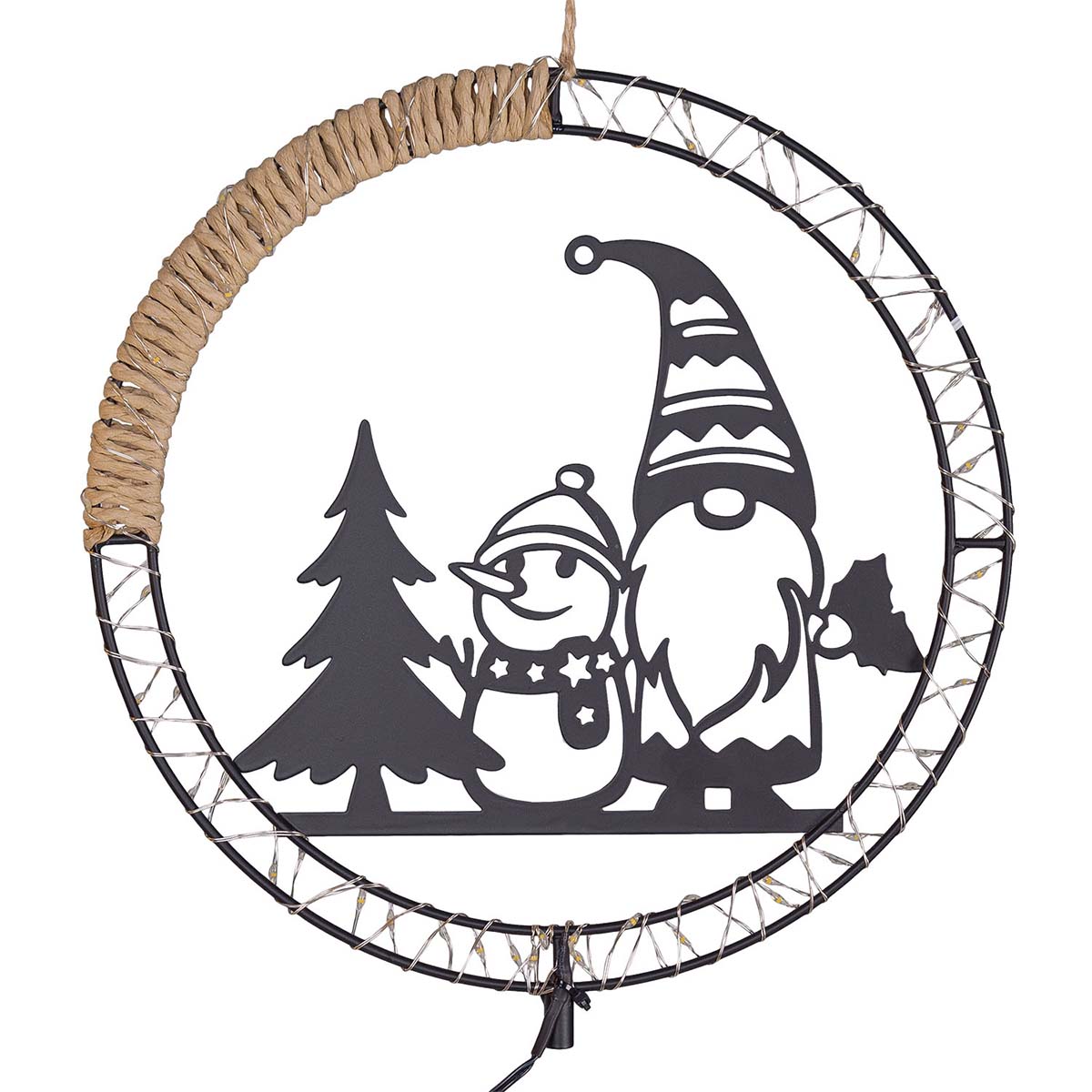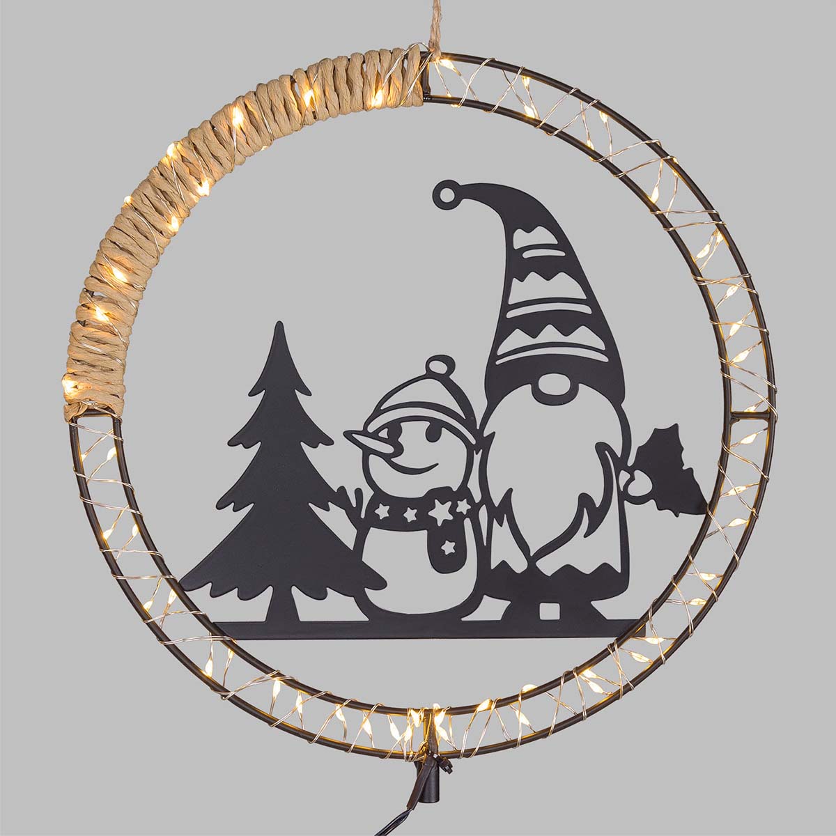 Aggiungi un tocco di eleganza e luce alle tue decorazioni con la corona natalizia luminosa da 25 cm. Una decorazione raffinata e moderna, realizzata con struttura in metallo nero e corda di carta, perfetta per essere appesa a pareti, porte o finestre durante le festività.