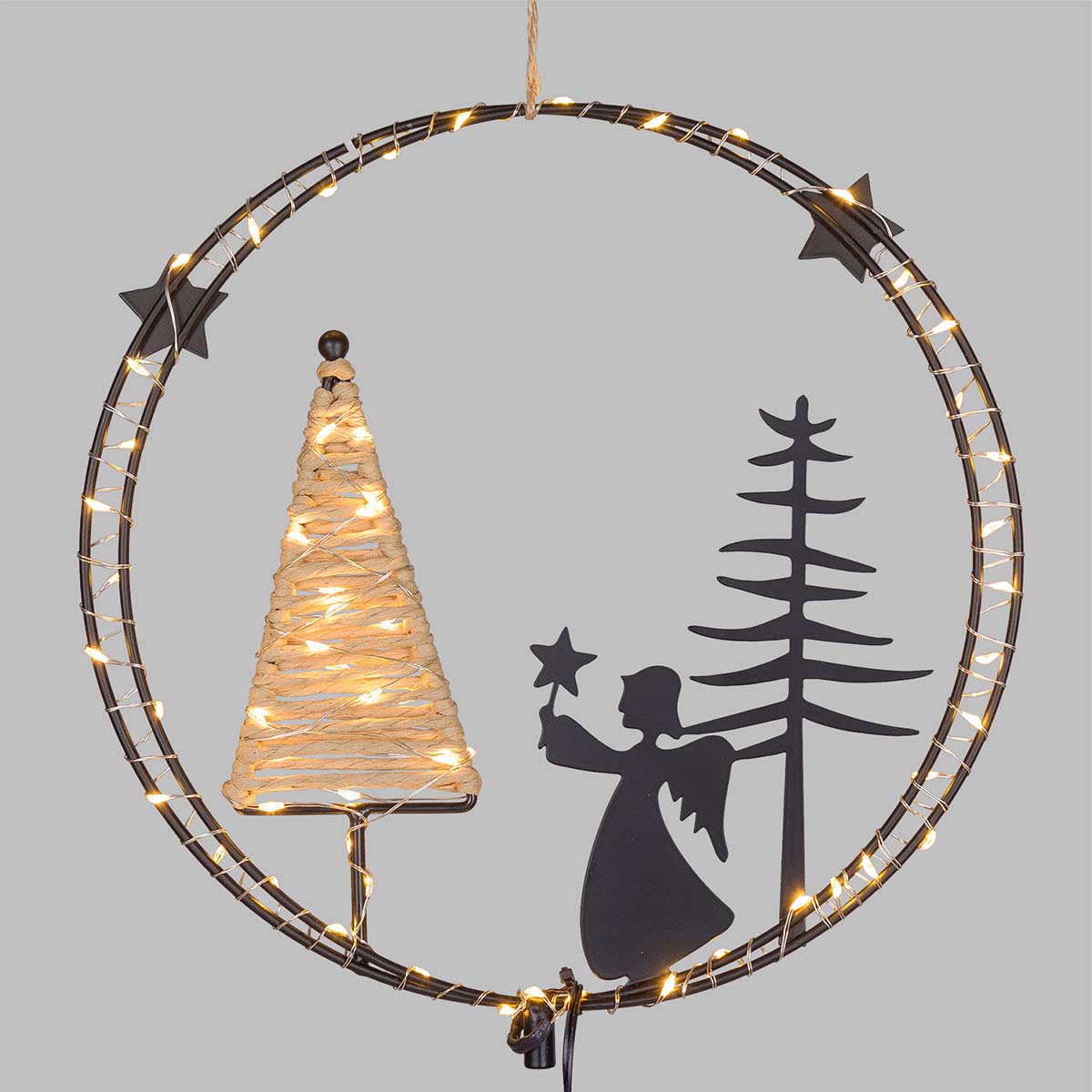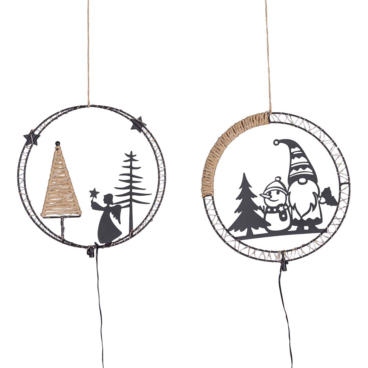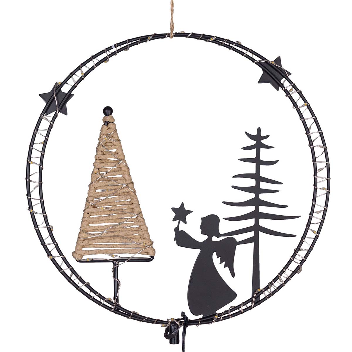 Aggiungi un tocco di eleganza e luce alle tue decorazioni con la corona natalizia luminosa da 25 cm. Una decorazione raffinata e moderna, realizzata con struttura in metallo nero e corda di carta, perfetta per essere appesa a pareti, porte o finestre durante le festività.