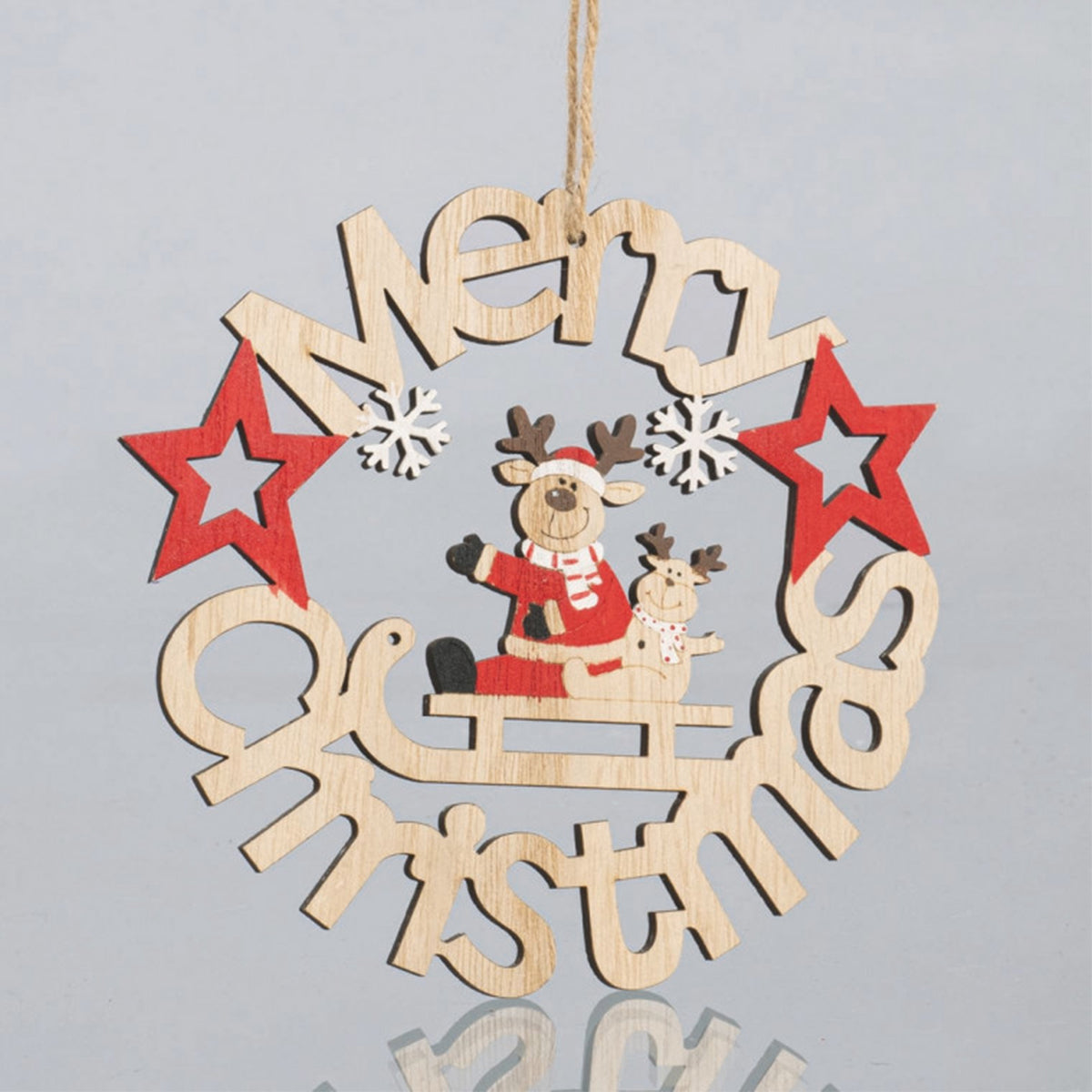 Decorazione natalizia in legno a forma circolare da 15 cm con intarsio “Merry Christmas”. Perfetta per aggiungere un tocco rustico e accogliente al tuo arredamento festivo