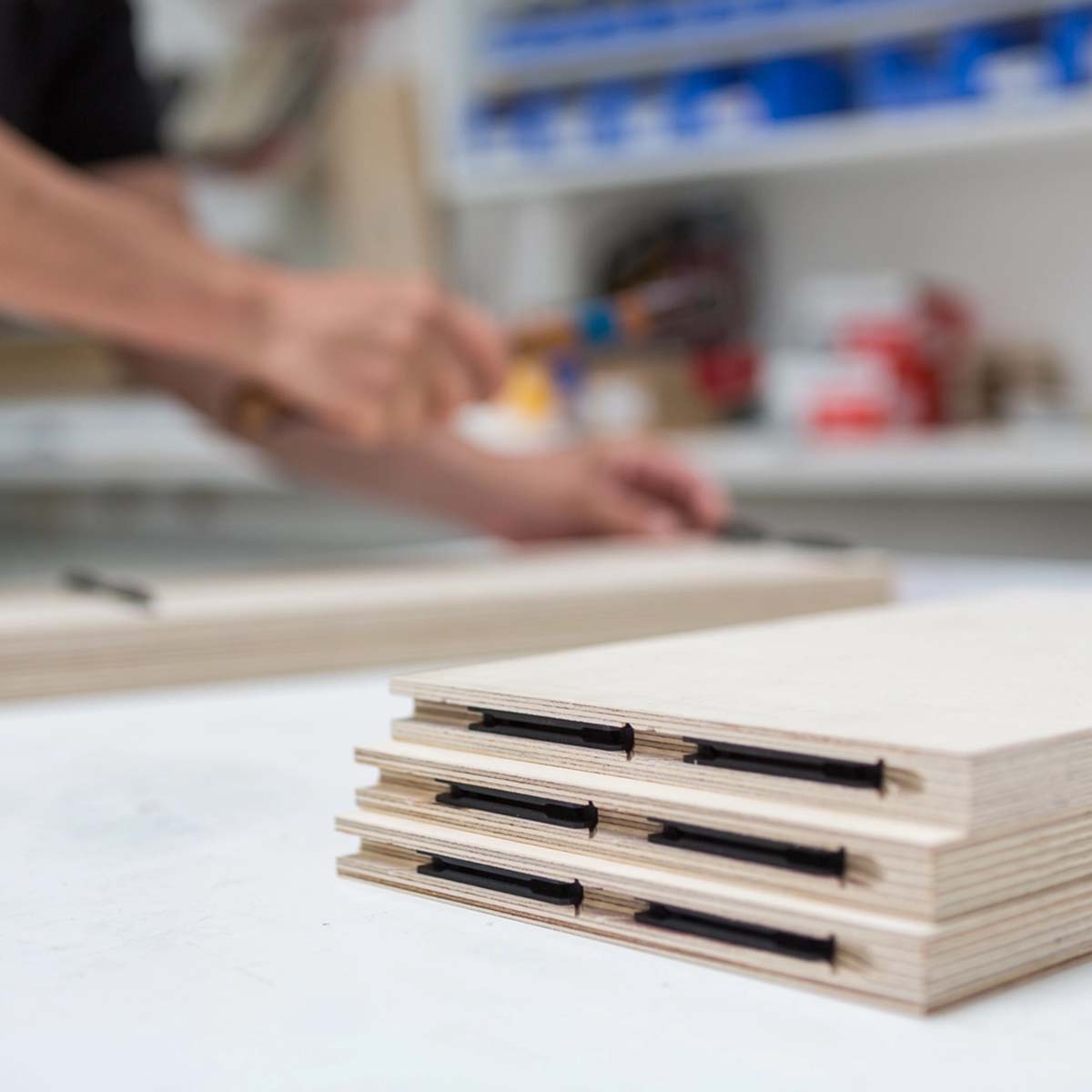 La fresata viene realizzata con fresatrice Zeta P2 o centro di lavoro CNC basato sul P-System e la giunzione si inserisce e blocca in pochi secondi. Questa soluzione permette di assemblare inizialmente solo la struttura esterna e inserire successivamente ripiani o divisori, ottimizzando trasporto e montaggio.