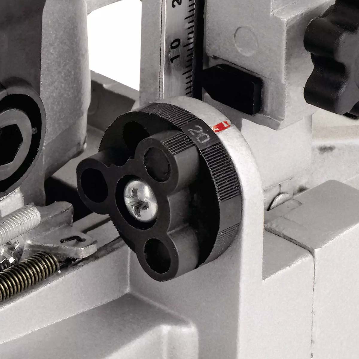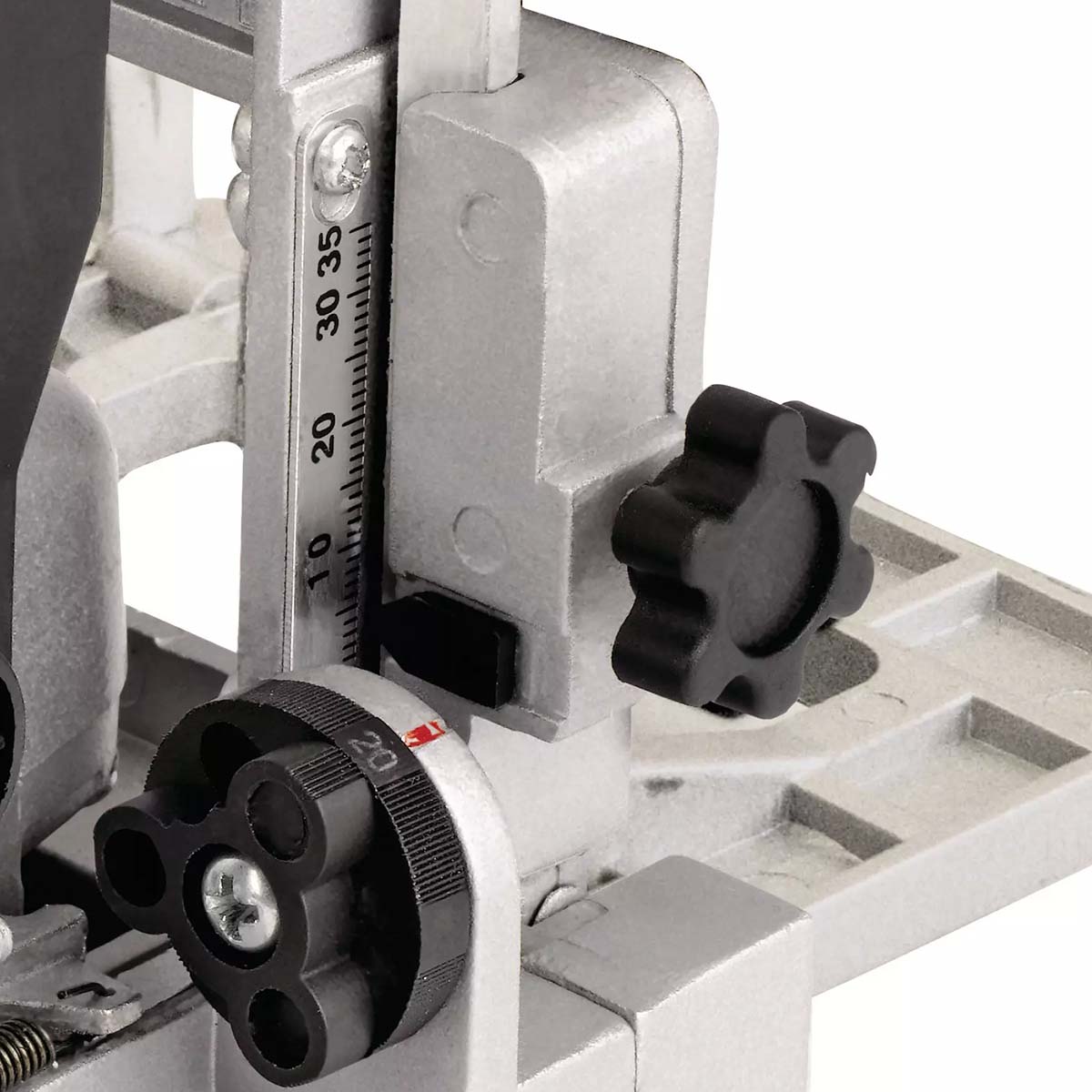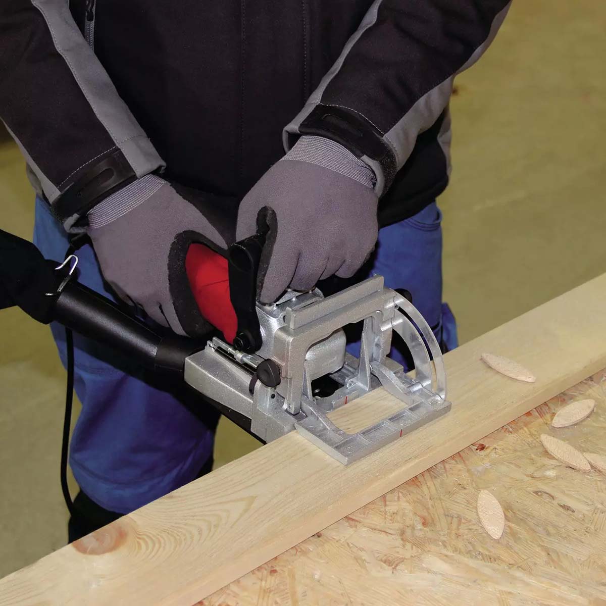 Grazie alla regolazione continua di inclinazione e altezza, è possibile creare strutture complesse con facilità e rapidità. La profondità di fresatura regolabile su tre livelli consente un’impostazione immediata e precisa in base al tipo di giunto da realizzare. La piastra di base in alluminio massiccio garantisce stabilità, scorrevolezza e precisione assoluta, mentre il blocco del mandrino semplifica il cambio rapido della fresa. Con una potenza di 860 Watt e una velocità massima di 11.000 giri/min, la TC-BJ 900 offre prestazioni costanti e risultati professionali anche nelle lavorazioni più impegnative.