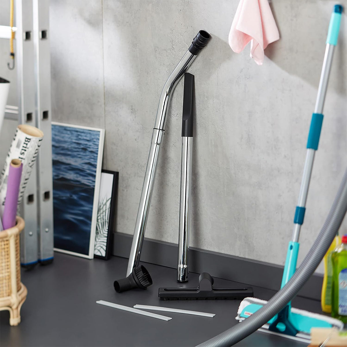 I due tubi di aspirazione in alluminio assicurano robustezza e leggerezza, mentre l’ugello combinato con inserti intercambiabili consente di adattarsi facilmente a superfici lisce o ruvide. La spazzola aspirante è ideale per raccogliere polveri sottili e residui di lavorazione, mentre l’ugello per fessure raggiunge angoli e punti stretti con precisione.
