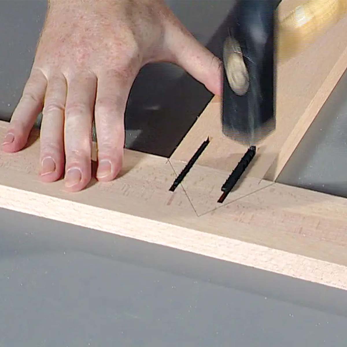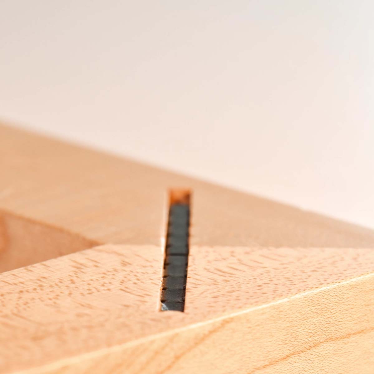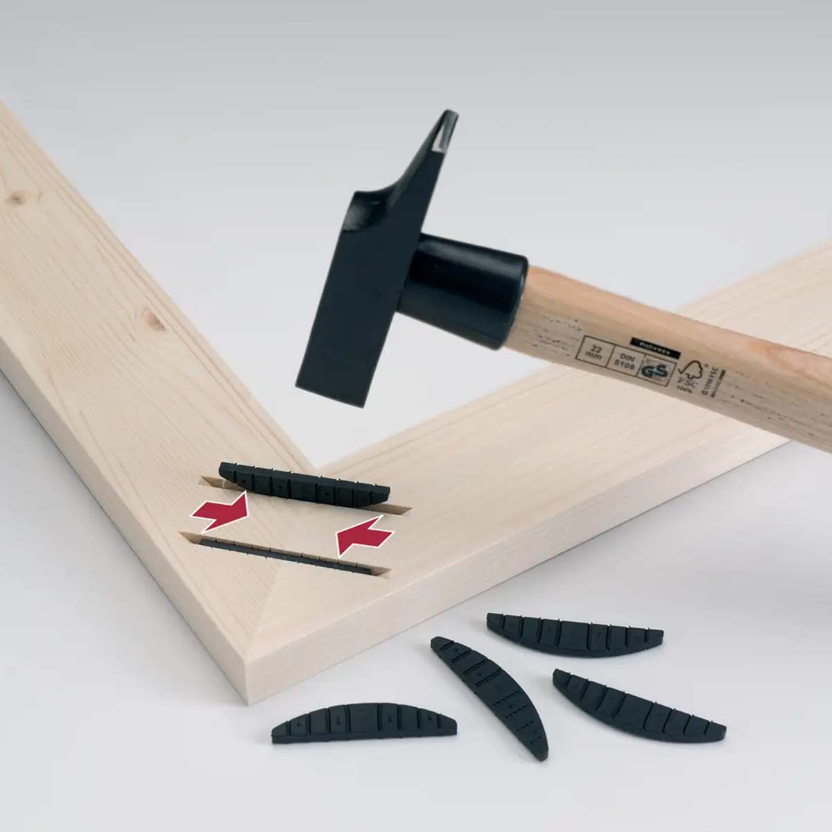 Le nervature oblique delle lamelle si ancorano saldamente nel legno e garantiscono un effetto autobloccante durante l’inserimento con martello. Ciò consente di serrare rapidamente i pezzi, anche in assenza di morsetti, con un’incollatura immediata e stabile, pronta per la successiva lavorazione.