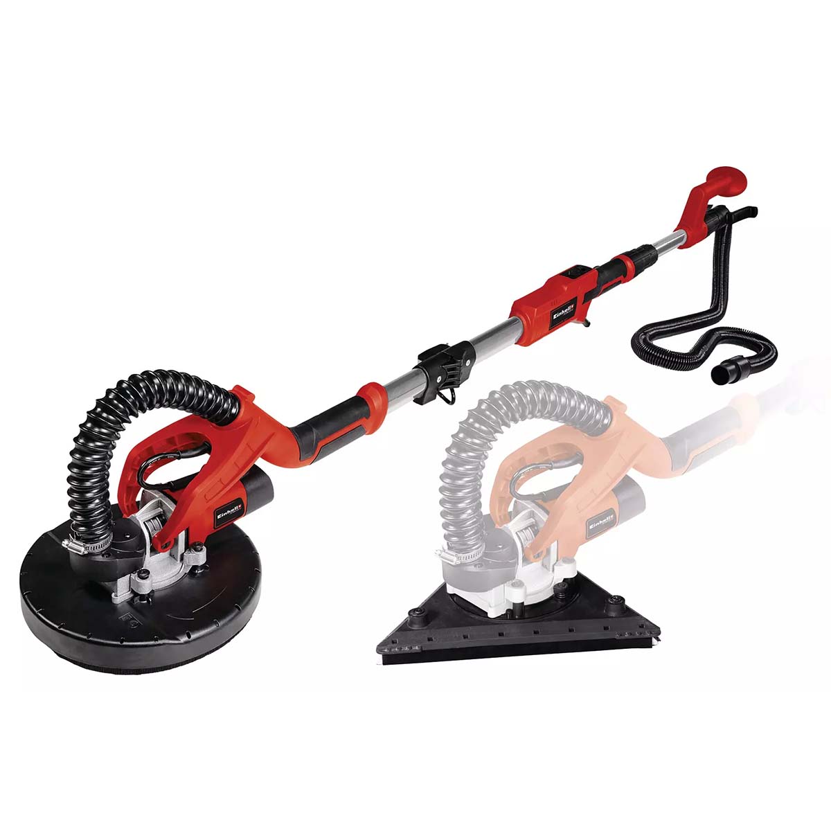 L’impugnatura telescopica regolabile fino a 165 cm consente di lavorare in modo ergonomico, anche sopra la testa, senza bisogno di scale. Il tubo di prolunga da 4 metri e il cavo di alimentazione lungo 4 metri offrono ampia libertà di movimento. La levigatrice TE-DW 225 X è fornita con 6 dischi abrasivi in corindone (3 rotondi e 3 triangolari) di diverse grane (P60, P80, P120), 2 fibre reticolate di alta qualità e la valigetta rigida Einhell E-Box per il trasporto e la conservazione.