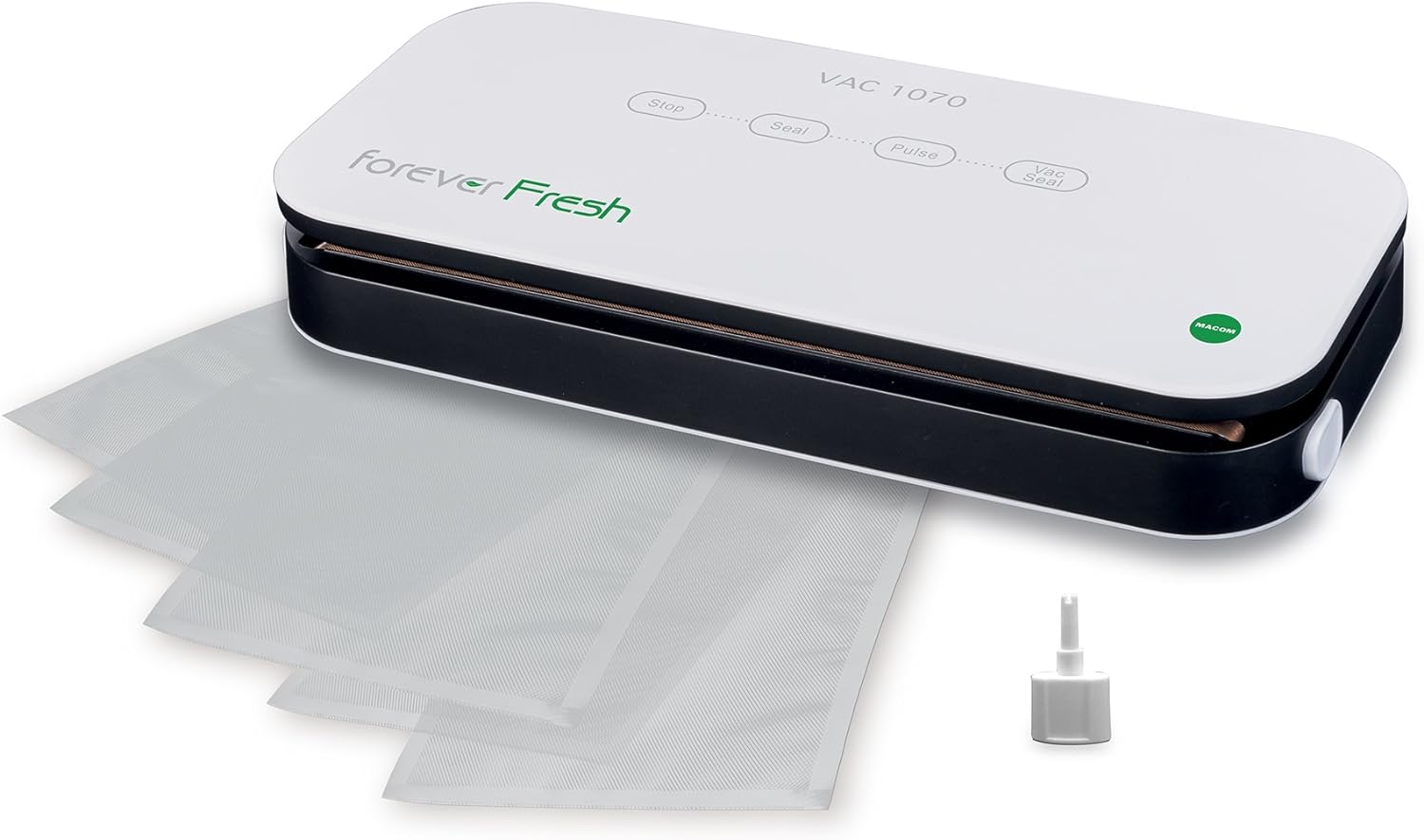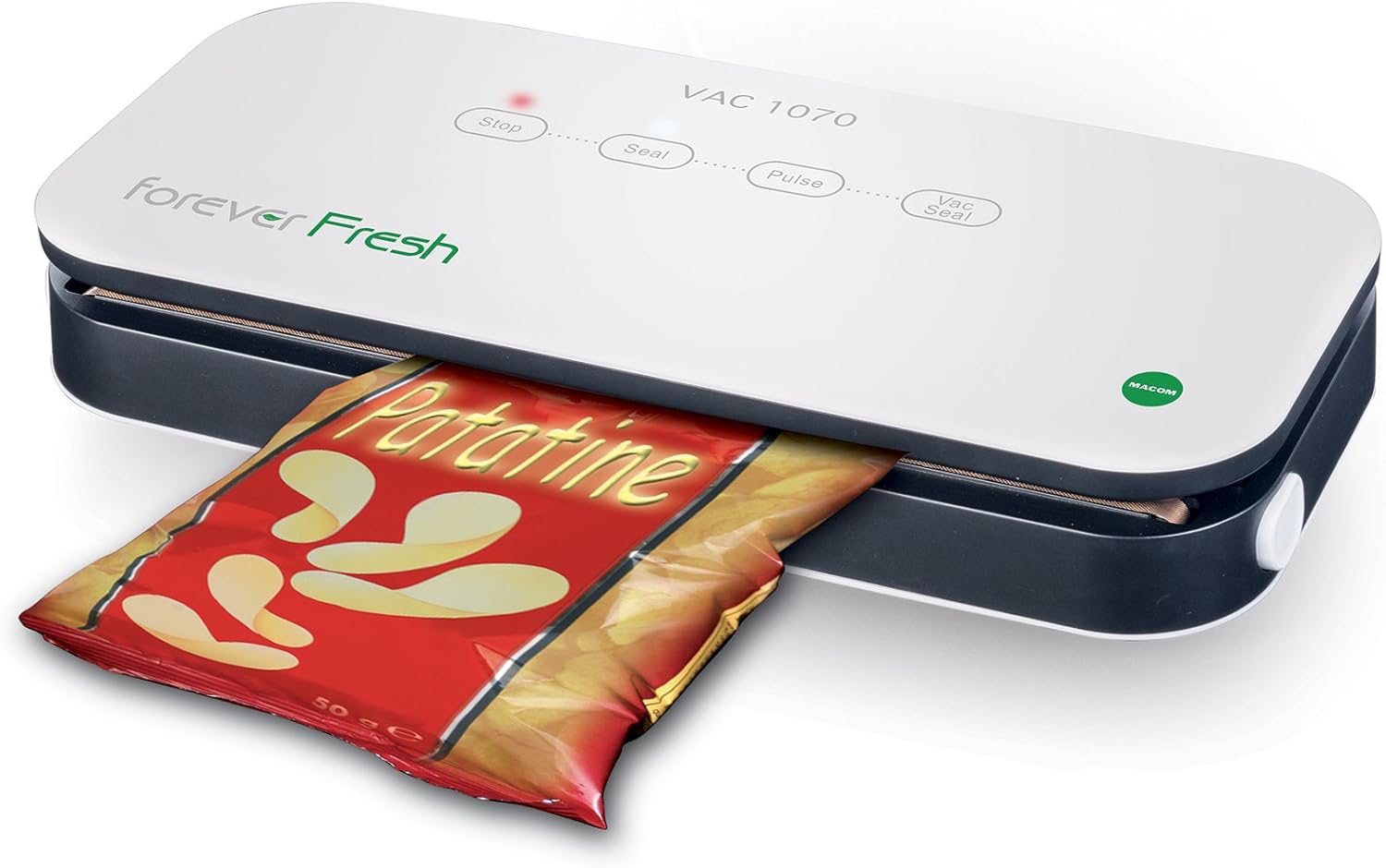La Macom Forever Fresh VAC 1070 è una macchina sottovuoto automatica dotata di funzione vuoto ad impulsi e barra sigillante. Questo apparecchio compatto offre un pannello di controllo Soft Touch e una barra sigillante di dimensioni doppie. Grazie alla funzione di impulsi, controllando l'aspirazione dell'aria, e al sistema Control Stop che consente di interrompere l'aspirazione in qualsiasi momento, è possibile confezionare ogni tipo di alimento, anche il più friabile. Scopri la comodità e l'efficienza della Macom Forever Fresh VAC 1070 per mantenere la freschezza dei tuoi alimenti più a lungo.