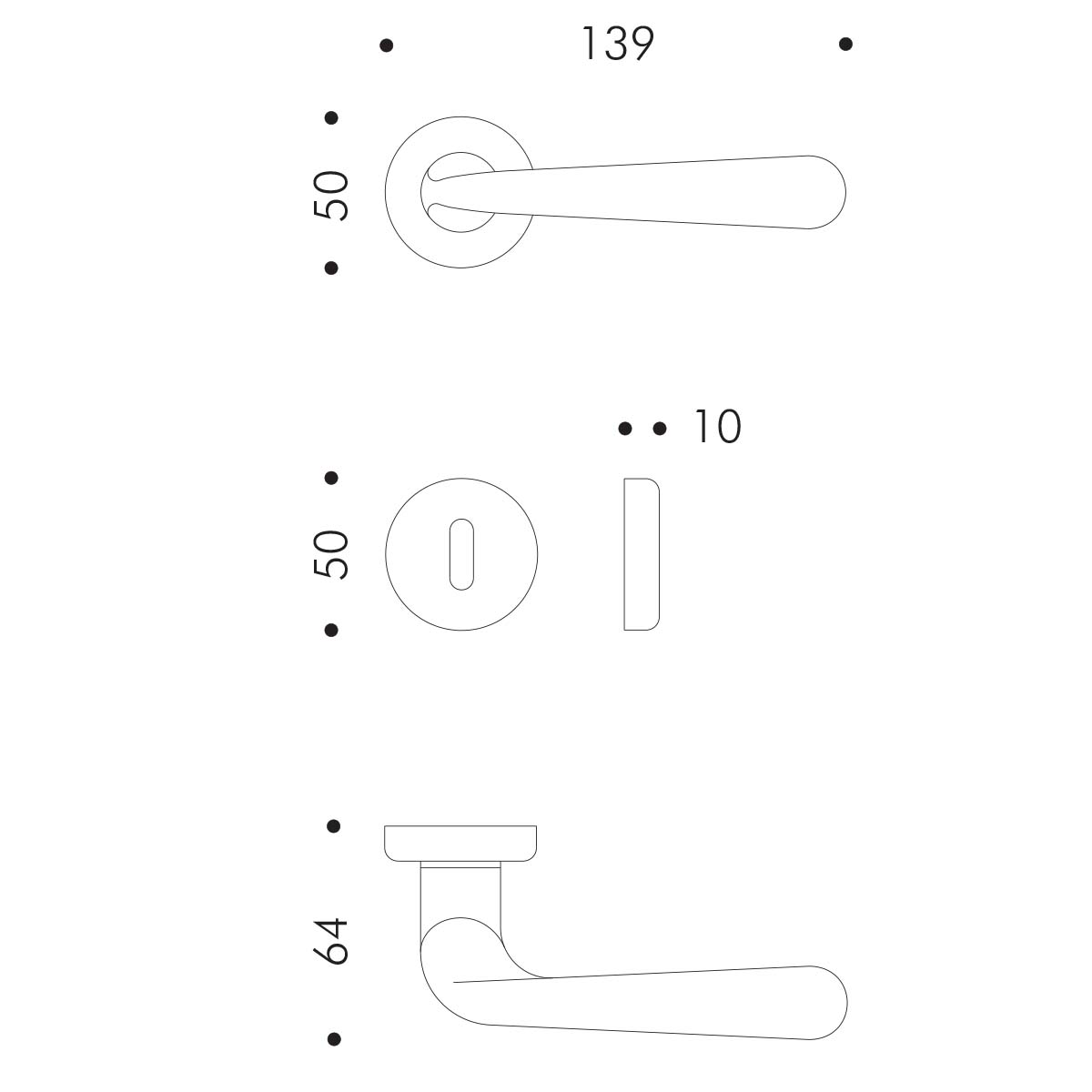 Completano il set la rosetta e la bocchetta tonde, entrambe con diametro di 50 mm e profondità di 10 mm, che offrono un'estetica pulita e proporzionata. Il foro Patent della bocchetta è compatibile con le serrature standard per porte interne.
