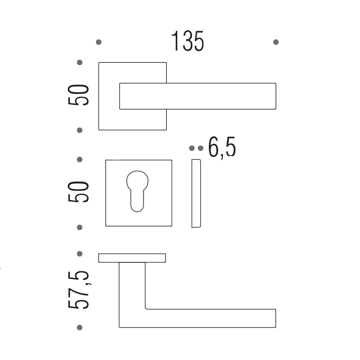 La rosetta e la bocchetta quadre, con diametro di 50 mm e uno spessore di 6,5 mm, completano l’insieme con discrezione e coerenza stilistica. La bocchetta è dotata di foro Yale.