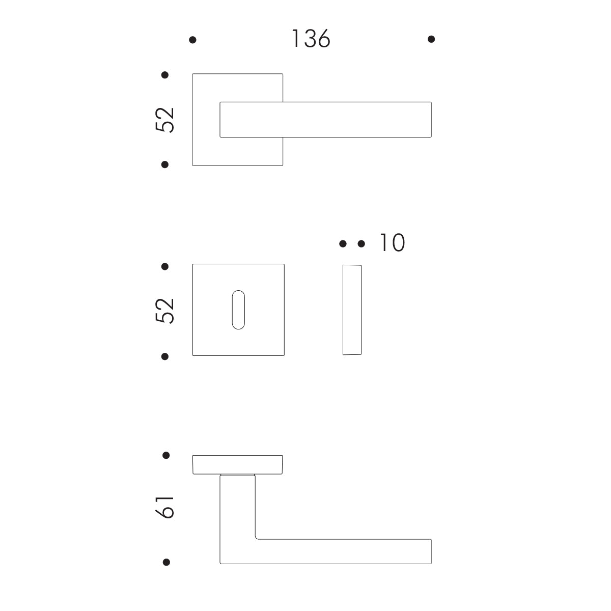 La rosetta e la bocchetta quadre, con dimensione di 52x52 mm e uno spessore di 10 mm, completano l’insieme con discrezione e coerenza stilistica. La bocchetta è dotata di foro Patent.