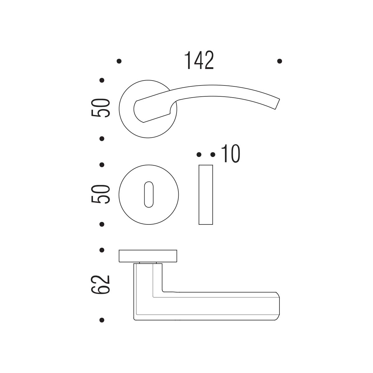 Completano il set la rosetta e la bocchetta tonde, con diametro di 50 mm e profondità di 10 mm, per un'installazione armoniosa su porte interne standard. Il foro Patent è compatibile con le serrature più diffuse, assicurando praticità e coerenza estetica.