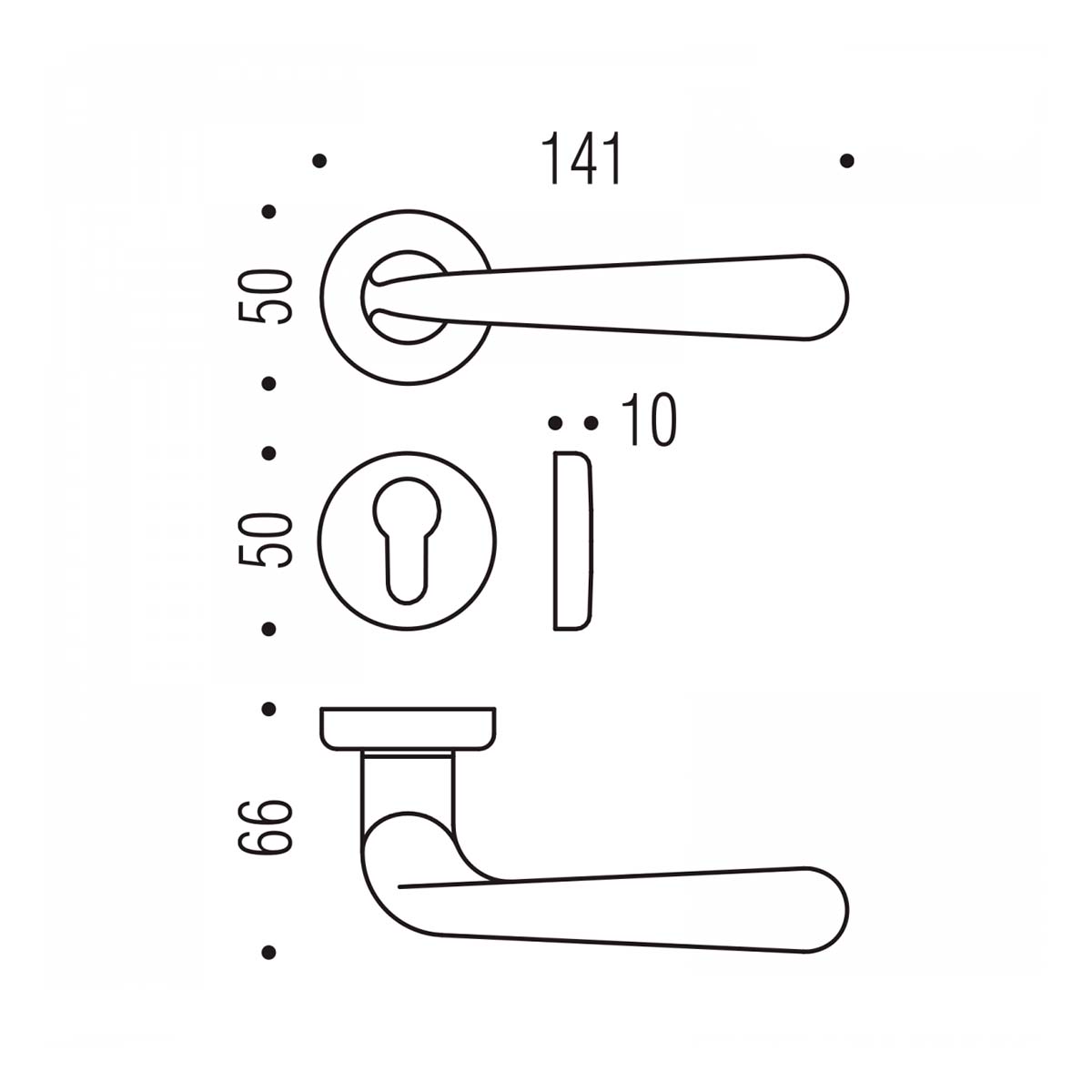 Completano il set la rosetta e la bocchetta tonde, entrambe con diametro di 50 mm e profondità di 10 mm, che offrono un'estetica pulita e proporzionata. Il foro Yale della bocchetta è compatibile con le principali serrature di sicurezza per porte interne.