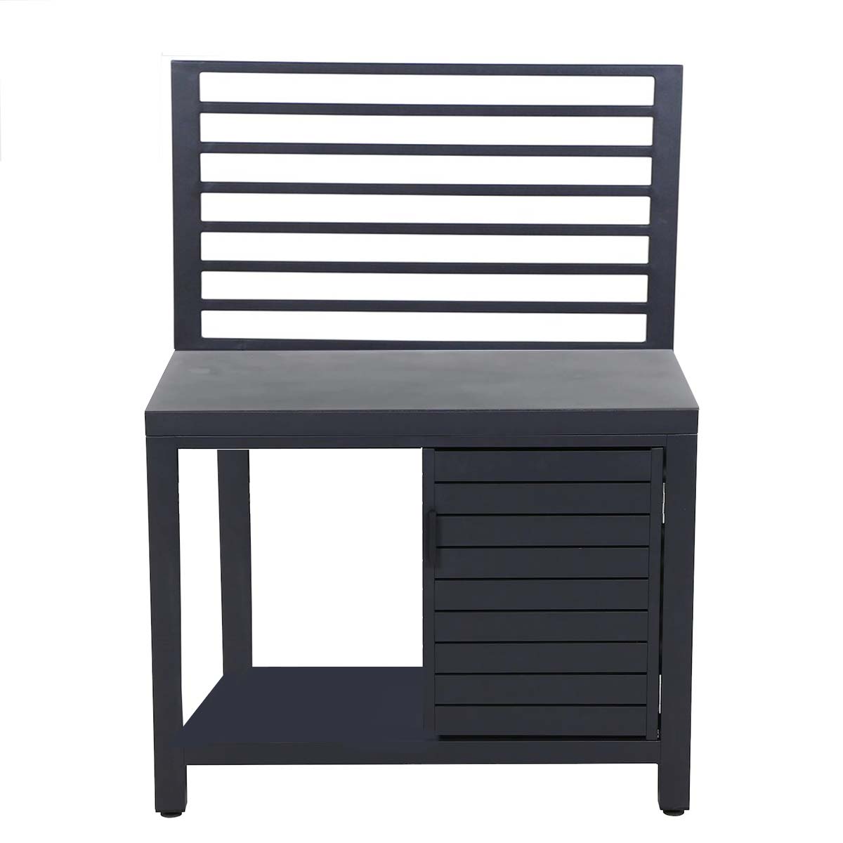 È dotata di tre pannelli laterali in alluminio che offrono protezione e struttura, e di uno sportello frontale che chiude un vano contenente due ripiani interni in alluminio, ideali per riporre utensili, stoviglie o scorte alimentari.