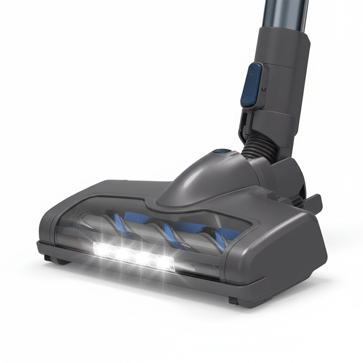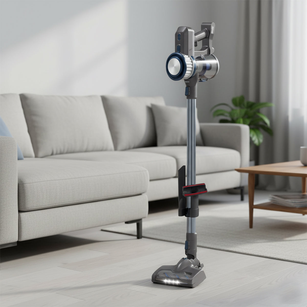 Il design free stand consente alla scopa di restare in posizione verticale senza bisogno di appoggio, e il tubo in metallo smontabile la rende comoda da riporre. Inclusi accessori pratici come beccuccio a lancia, spazzola per tessuti e supporto a parete per la ricarica.