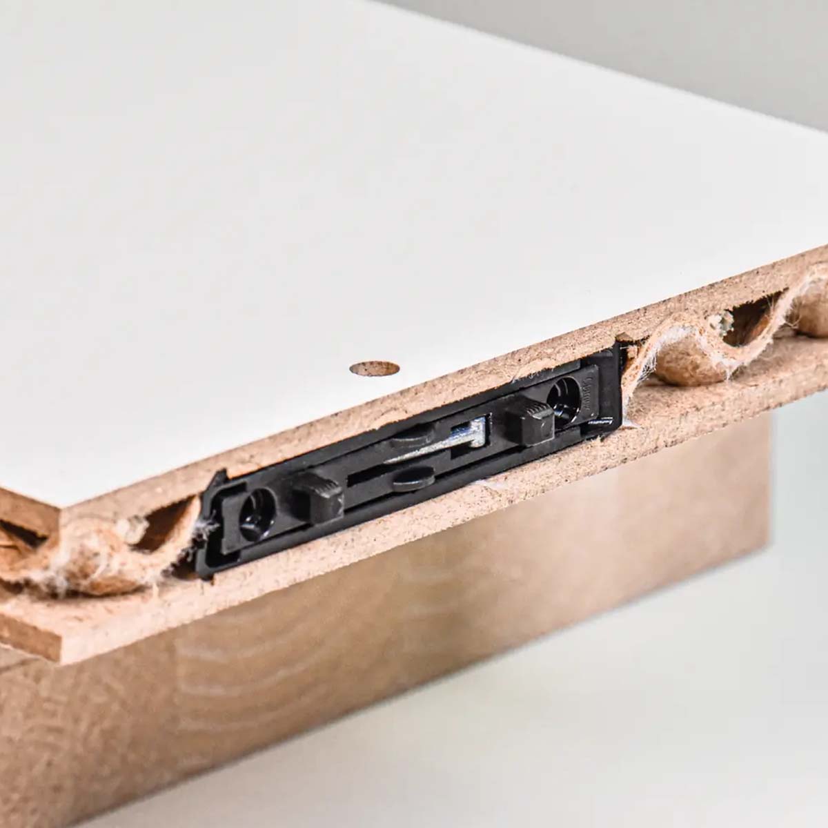 Grazie al sistema P-System, il processo di montaggio è rapido e lineare: le fresature, effettuate con la fresatrice Zeta P2 o un sistema CNC, si allineano perfettamente utilizzando il distanziale da 2 mm. Il montaggio è semplicissimo: l’LC P-16 si inserisce, la semigiunzione si innesta nel profilo, e la giunzione P-System è pronta all'uso, perfetta per arredi leggeri, mobili imballati a flat-pack o strutture da montare in cantiere.