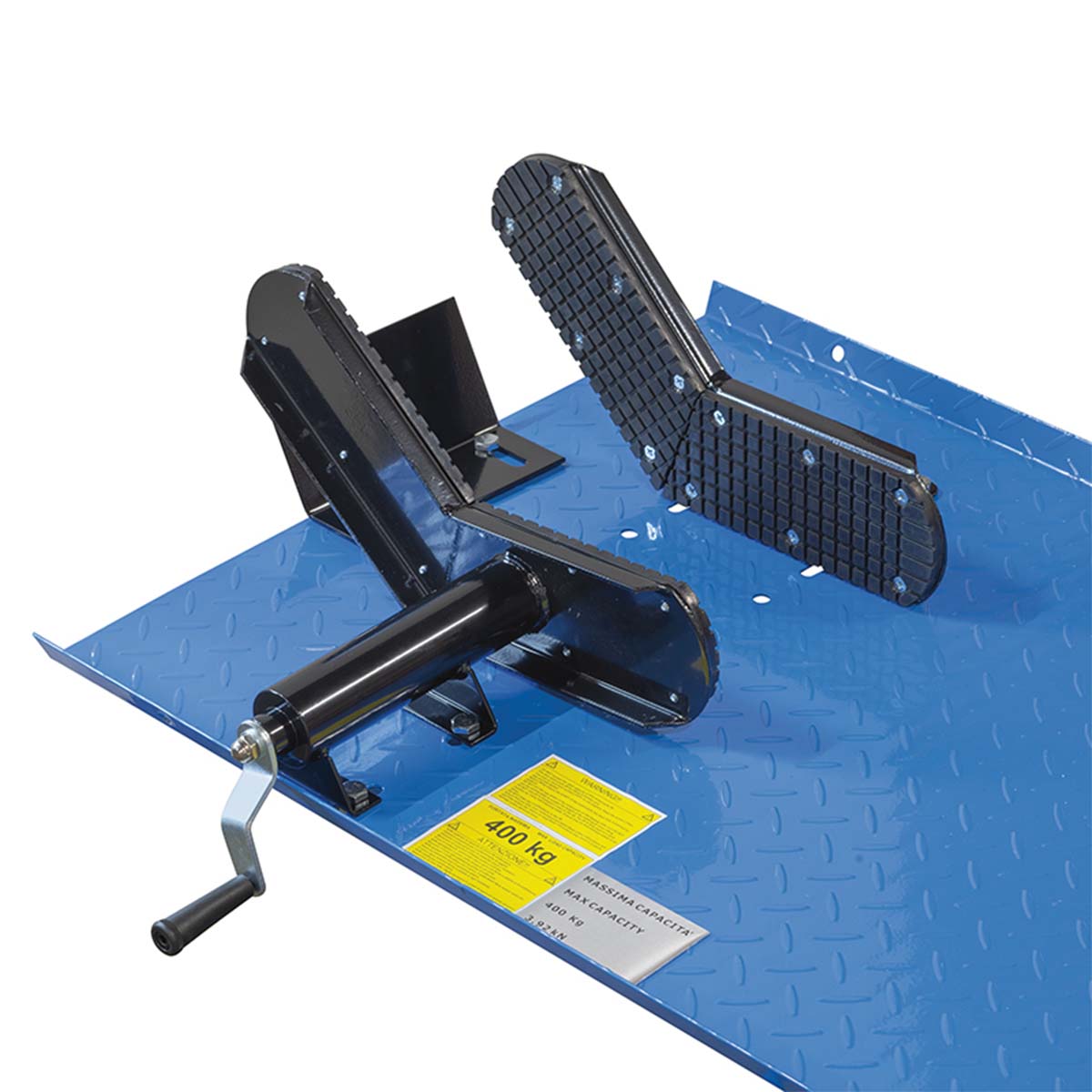 Con una capacità di carico fino a 400 kg, è adatto per la maggior parte delle motociclette. La piattaforma da 1825 × 660 mm garantisce stabilità, mentre la morsa regolabile da 410 × 100 mm con apertura di 210 × 50 mm assicura un fissaggio saldo della ruota anteriore.